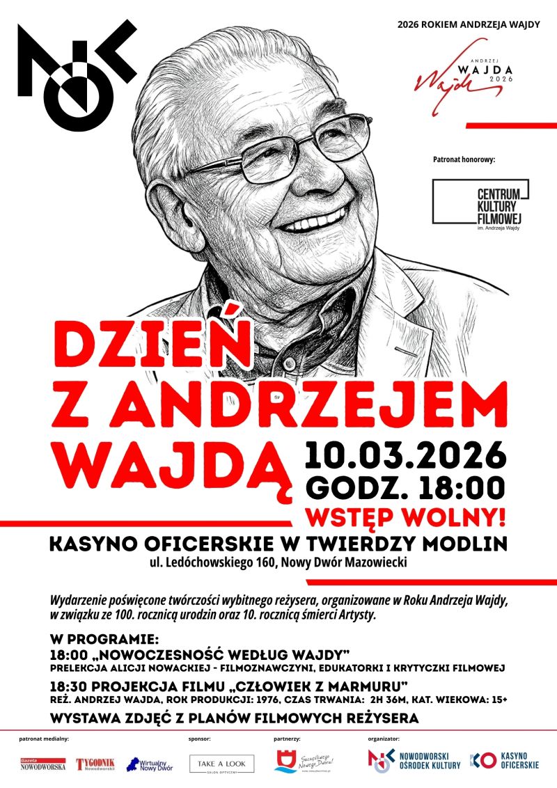 Nowodworski Ośrodek Kultury zaprasza na filmowe spotkanie z twórczością patrona roku 2026 – Andrzejem Wajdą. Razem podążymy mniej utartymi ścieżkami myślenia o jego kinie, szukając w nim nowoczesnych tropów. Dzień z Andrzejem Wajdą odbędzie się 10 marca 2026 r. w Kasynie Oficerskim w Twierdzy Modlin i będzie okazją do spotkania z jego dorobkiem artystycznym w roku setnej rocznicy urodzin oraz dziesiątej rocznicy śmierci twórcy.